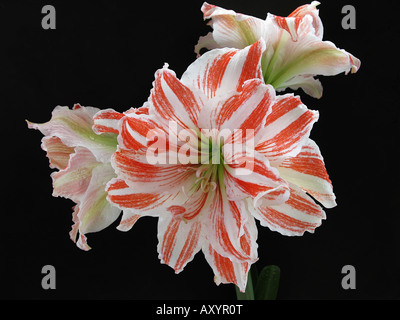 En cada pedúnculo se desarrollan entre 6 a 7 flores grandes. Cuando están completamente abiertas, cada flor alcanza un diámetro de 15 a 20 cm. Tienen una elegante forma de copa con pétalos flexibles. Las flores se orientan hacia arriba y presentan un color singular: en la base, los pétalos tienen un tono cremoso que se torna rojo fuego hacia el centro, adornados con pinceladas amarillas y venas carmesí cerca del centro. Los colores vibrantes y llamativos de la planta contrastan espectacularmente con el verde del follaje.