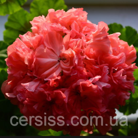 Esta planta presenta un aspecto atractivo y compacto, con hojas de un verde vibrante y un notable nivel de ramificación. Sus tallos son verticales y los arbustos son visualmente impresionantes. Las flores, formadas en inflorescencias de tipo paraguas, son grandes y lucen como rosas en plena apertura, con pétalos de un color melocotón anaranjado que tienen un bello rizado.