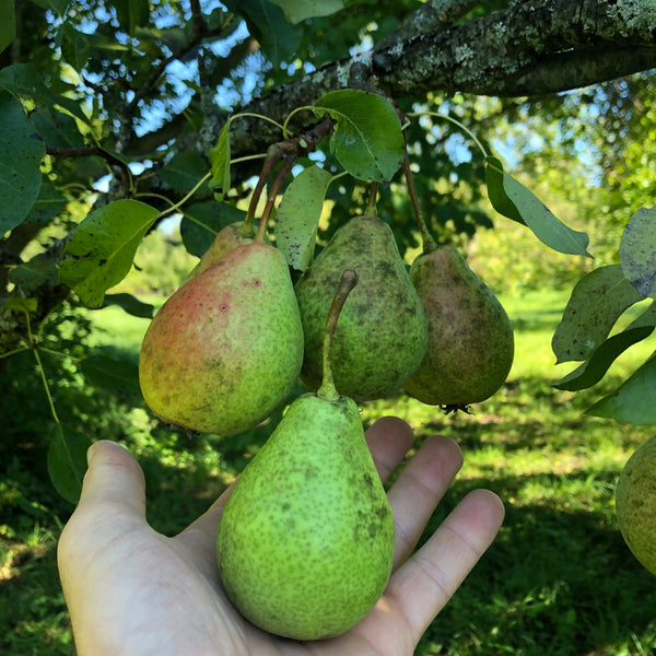 Los brotes de la pera son gruesos y curvados, con una superficie peluda. Su color es marrón. Las hojas son amplias con una forma alargada y su superficie es lisa, de un verde profundo.