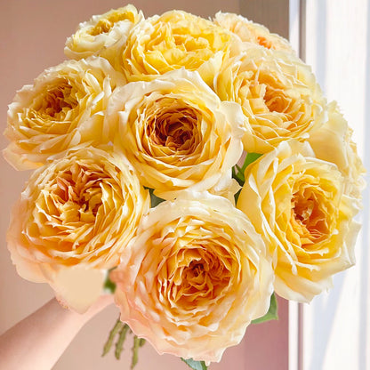 Las flores son abundantes y grandes, con un diámetro de 8 a 10 centímetros, poseen forma de copa y están densamente pobladas, conteniendo entre 100 y 120 pétalos. Pueden encontrarse de forma solitaria o en pequeñas inflorescencias, llegando a haber de 1 a 3 flores por tallo. Su coloración es una mezcla de tonos amarillos miel y albaricoque, con un rubor rosado hacia el centro. Los capullos tienen una forma redondeada con una ligera punta en la parte superior. El aroma es suave; primero se percibe un ligero olor a rosa de té y luego se revelan deliciosas notas frutales.