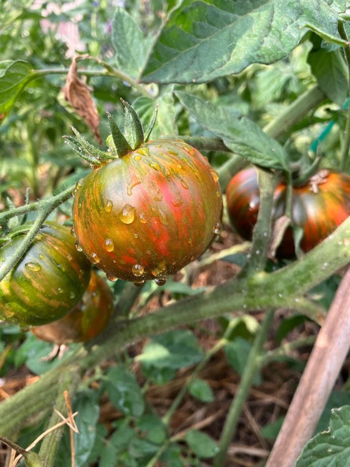 Los tomates maduros presentan un color marrón claro o marrón rojizo y su peso oscila entre 300 y 350 gramos. Su forma es redondeada.